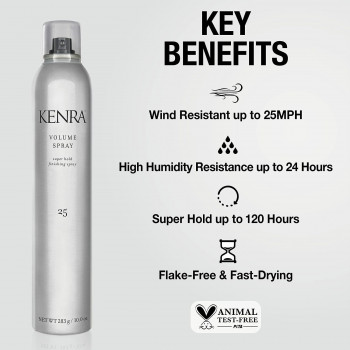 • Kenra Volume Spray 25 provides the maximum amount of volume and hold possible. This volumizing spray leaves hair looking natural and shiny while imparting the strength and volume necessary to make any style last all day.
